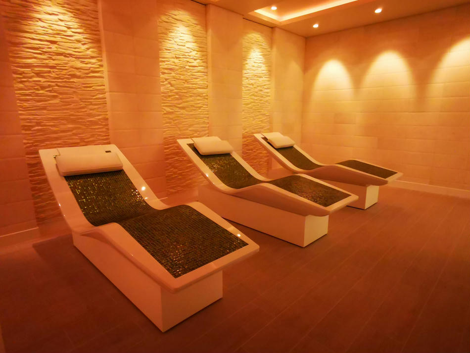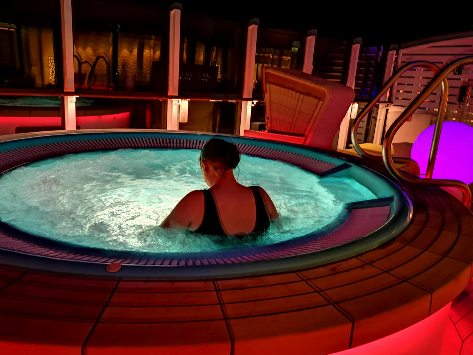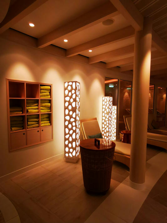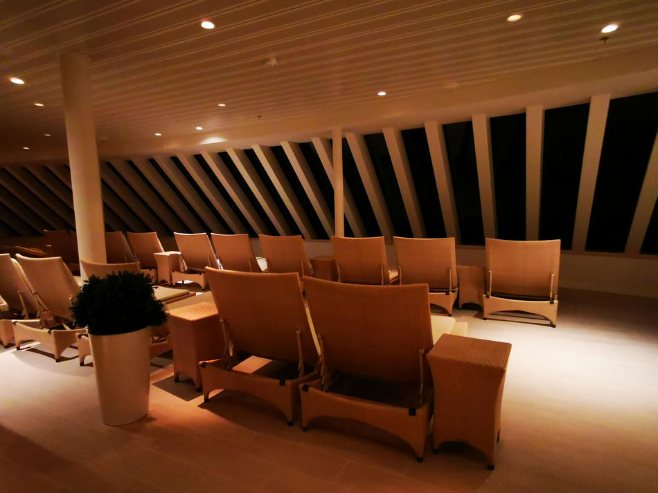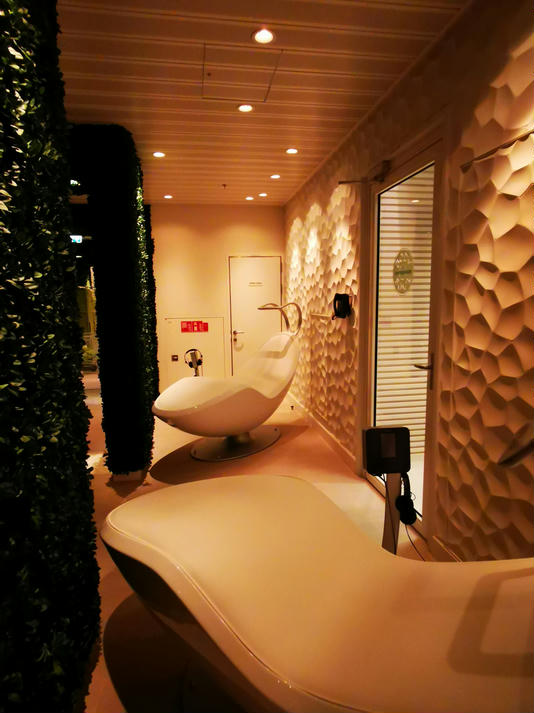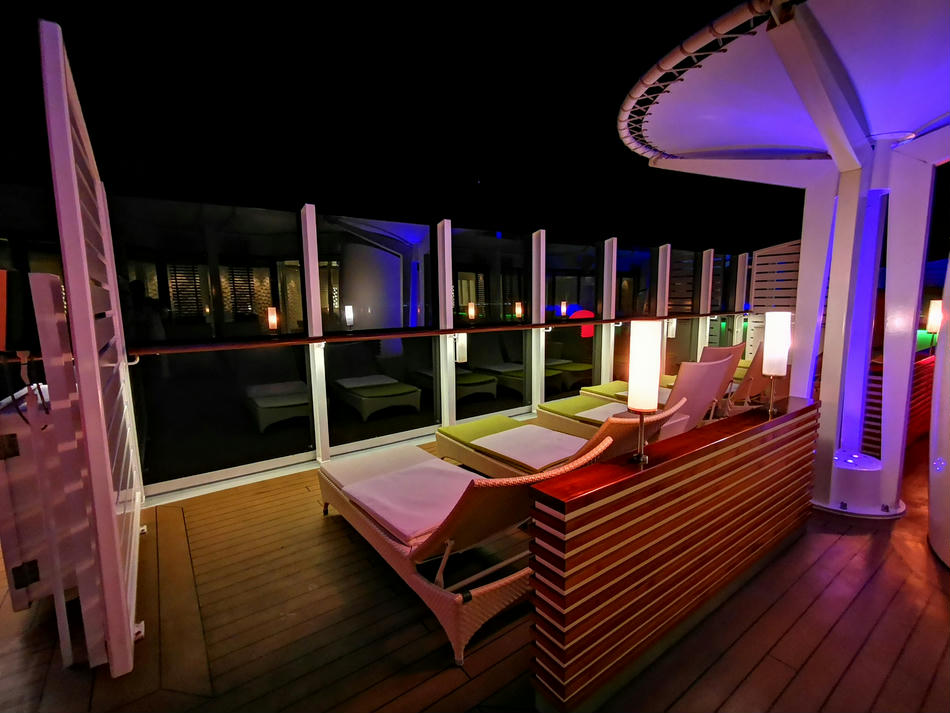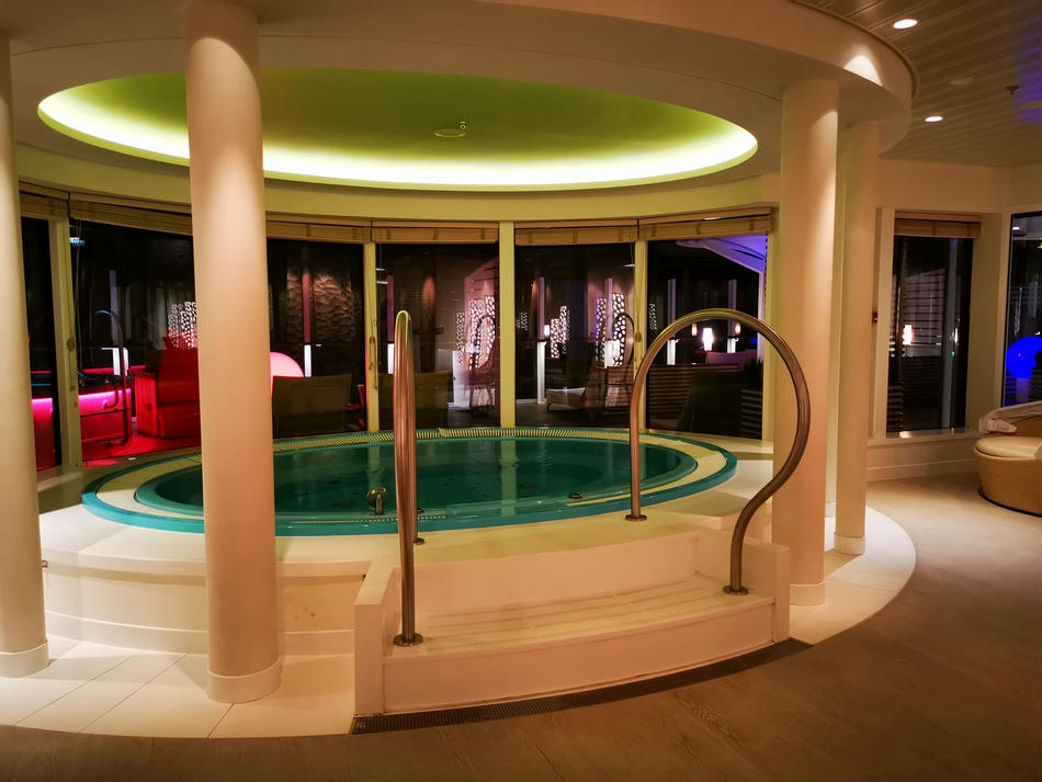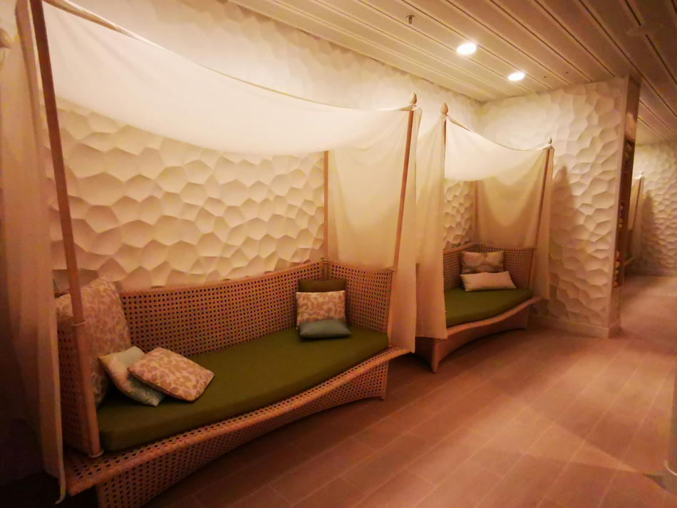 Hier gibt es dann 5 verschiedenen Saunen, Tepidarium (dies ist ein Wärmeraum, in dem Bänke, Liegen, Wände und Boden beheizt sind), ein Kaminzimmer, ein privates Spa-Sonnendeck mit Liegen und Strandkörben, Cabanas, also private Räume, ganz viele Liegen, ein paar Wasserbetten und insgesamt 5 Whirlpools, die im Innen- und Außenbereich verteilt sind. Außerdem gibt es eine Tee- und Wasserstation, die aber nur mit Plastikbechern ausgestattet ist.
