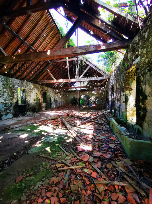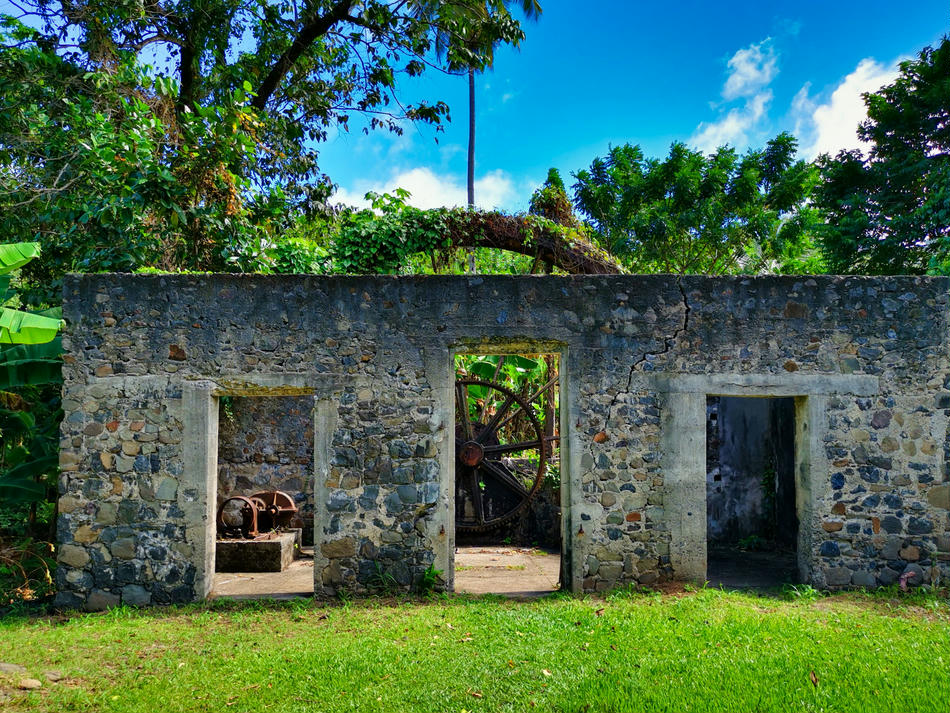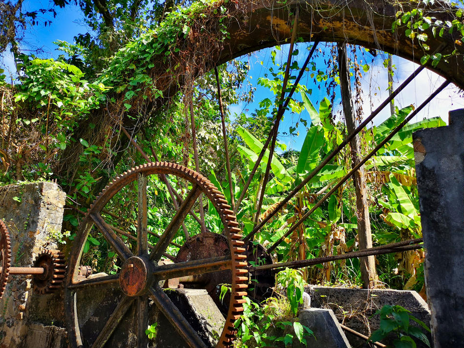 Nach ca. 20 Minuten (die sich jedoch nur wie zehn angefühlt haben) haben wir einen ersten Stopp gemacht. An einer kleinen Ruine mit einem großen Zahnrad sind wir kurz von unseren ATVs abgestiegen, um uns etwas umzusehen. Hier war es schon ziemlich schön, aber das Fahren hat nunmal umso mehr Spaß gemacht, weshalb wir uns gefreut haben, als es schon bald weiter ging. Weiter, durch die Weiten des Urwaldes und der Zuckerrohrfelder von St. Lucia.