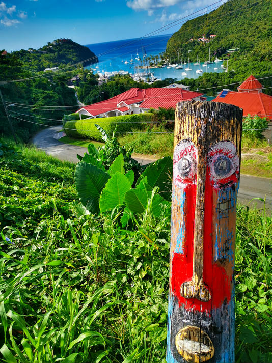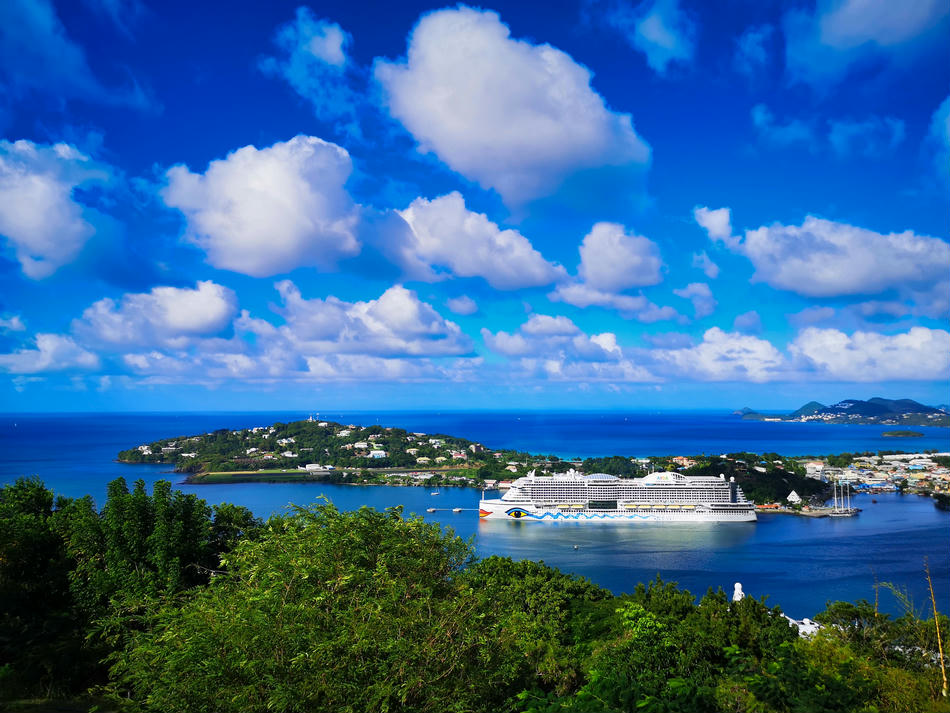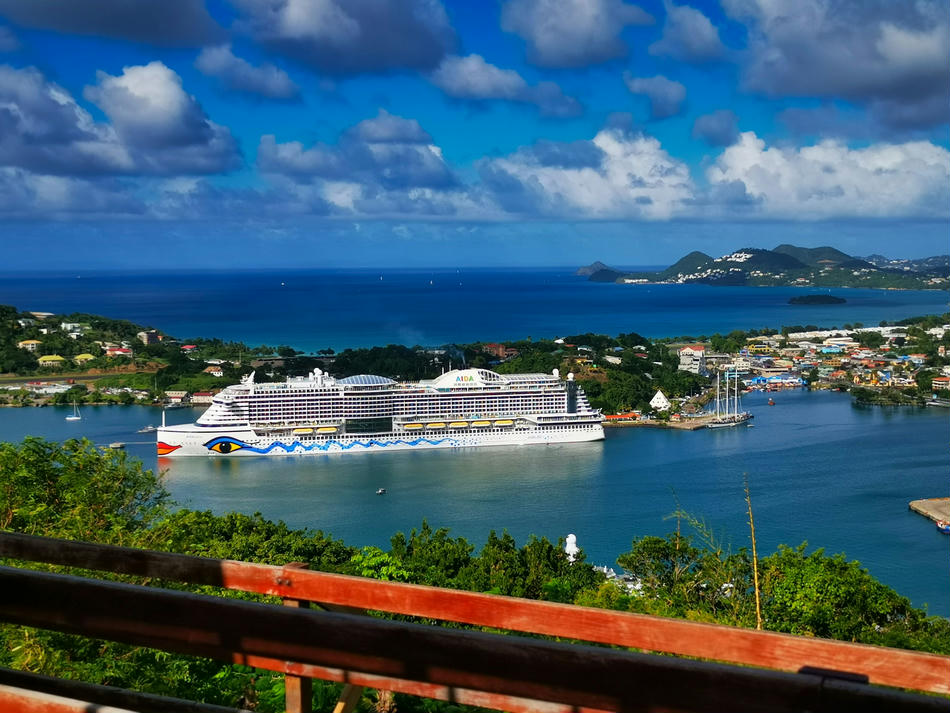 Nach der Pause am Shop fuhren wir auch schon wieder zurück in Richtung der Hauptstadt Castries, wo unser Schiff lag. Kurz vor der Stadt hielt unser Fahrer noch einmal an, da es hier eine tolle Aussicht auf das Schiff gab. Knapp oberhalb von ein paar Serpentinen gab es eine kleine Haltebucht und eine Holzplattform für Touristen wie uns, die den Kreuzfahrthafen fotografieren wollten. Die Aussicht lockte neben uns auch ein paar einheimische Souvenirverkäuferinnen an, die direkt versuchten kitschig bunte Dinge an uns zu verkaufen. Kühlschrankmagnete, T-Shirts, Schals, Taschen und alles andere, was man nicht braucht, gab es hier. Die Aussicht war wirklich sehr schön und ich glaube wir hatten wirklich Glück, dass wir hier allein waren. Der Größe nach zu urteilen geht man hier sonst von etwas mehr Andrang aus.